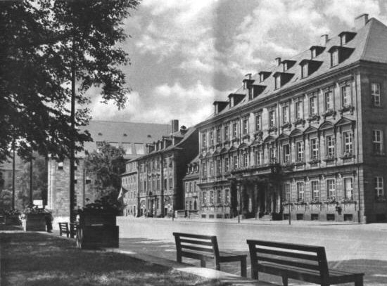 Aufnahme des Luitpoldplatzes (damals Hans-Schemm-Platz) aus einem Bayreuth-Prospekt von 1938. Rechts das durch Bomben und Stadtplanung beseitigte Reitzenstein-Palais - links das Haus der Erziehung (heute E-ON). |